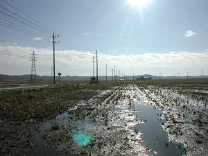 江戸崎保育園の南側300m付近にある鉄塔近くから南側を臨む。水の残った初冬の田は陽の光を映して眩しい。