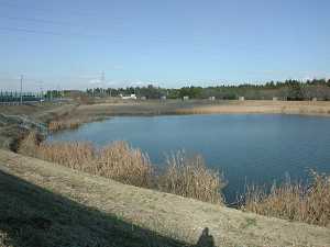 福田工業団地北側調整池からの風景。池の向こうにすでに橋脚が建っている。