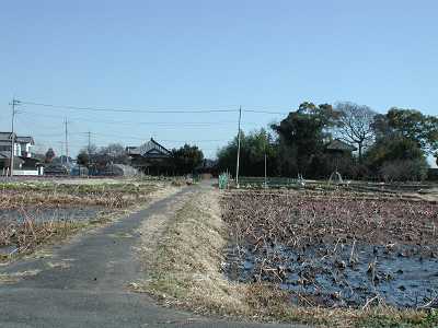 | 訪問記 | [2001/11/26]JR常磐線土浦駅の北約2kmにある第一浅間下踏切近くに土塁と古池に囲まれた墓所がある。ここは遺構の一部だろうか。そこから100mほど南に電車区へ入る地下道があり説明板が立っている。地下道を上がったところに信太氏一族の墓がある。ここは電車区内なので通過列車に注意して下さい。 [2004/01/26]今日は嫁さんの友人で木田余に生まれ育ったに方に周辺を案内してもらったおかげで、木田余城のイメージがかなりはっきりしてきた。知らないと騙されてしまうよ。 常磐線によって完全に湮滅したといわれてはいるが、なんらかの痕跡がないのか、『土浦城とその城主たち』の解説を参考に手掛かりを列挙してみた。 (1)常磐線によって東西に2分されている。 (2)本丸跡は小字を中城といいほぼ300m四方の範囲。 (3)今でも北堀・南堀などの地名が残っている。(追記:横堀の地名もある) (4)城はもと木田余の台地の「城の内」とよんでいるところにあった。 (5)木田余城主信田範宗の墓は木田余城跡内信太八幡境内にある。五輪塔3基が残る。 もともとJR常磐線は現在の下り線路側のみにあったものを、わりと最近になってから電留基地建設のために東側へ拡幅したため、中城の畑地が湮滅した。この事情を知らずに『土浦市史』を読むと前回の私のように、JRの地下道を上がったところにある石碑が信太氏一族の墓だと思ってしまうのではないだろうか。電留基地にある「信太氏一族の墓」は、城跡を線路の下に埋めちゃったので、祟りを畏れて設置した新しいのかもしれない。あの標柱は木田余城の本丸(中城)跡を示しているだけで、実はこれとは別に常磐線の西側、浅間下踏切の南西300mに信太一族ゆかりの五輪塔といわれるものが三基ある。ここも木田余城本丸の一画で信太八幡境内といわれるが現在神社は無い(現在宝積寺が管理している)。ただ、五輪塔の裏に小さな「八幡」と彫られた石が置かれていた。戦国時代の木田余城の前身にあたる「木田余城ノ内」は600mほど北西にあたる。 |