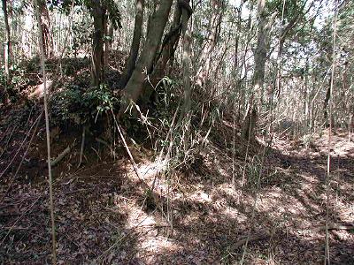 | 訪問記 | [2003/04/07]新治浄水場との間の道に車を留めて、城址の北東側に最近篠竹が刈られた道があったのでそこから登る。途中からは道が無くなってしまったがとにかく高い方へ高い方へと取っていくと堀と土塁に到達した。土塁の南側には石の祠がいくつかありここへの参拝道があるはずだと直感。最初の地点へ戻る自信は無かったが、南へ真っ直ぐ降りていく道があったので辿っていくとあっという間に城址南側下の道に降りられた。この登り口はコンクリートの階段になっているので見つけやすいと思う。 |