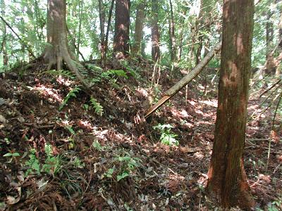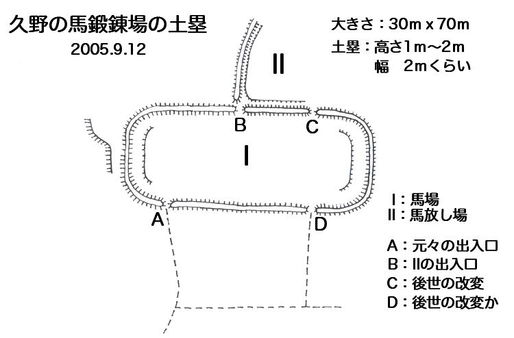 | 概説 | 高さ約0.8mから2m、縦横30mx70mほどの長楕円形の土塁が全周に渡って良く残っている。土塁の内側は浅くなった堀のように見えるが、馬を走らせた馬場だったとのこと。土塁の北側の虎口は馬放し場へ通じていたという。北東側の虎口は後に木の切り出しのために開けたという。地主Sさんの(上長(阿見町)の大久保意吉氏の厩番をしていたこともあった)祖父が救済事業の一環として茨城県の許可と補助金をもらい馬の鍛錬場として造成したという。 |