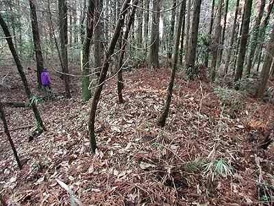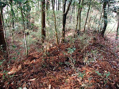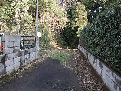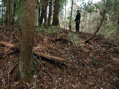 | 訪問記 | [1998/03/30]倉庫敷地工事のためほとんど湮滅状態。土塁の輪切りの一部なのか、たんに道路工事の時の残土の山なのか。希望として、土塁の断面だと思いたい。[その後これは確かに土塁の跡だと確認しました] [2001/03/18]以前「かつては土塁の途中がクランクになっており、横矢掛かりの仕掛けがあったように想像できる。見てみたかった。」と書いたが、奥の杉林へ入ってみるとすばらしい土塁が今も残っていた。 |