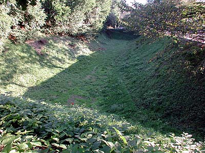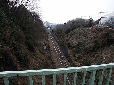 水郡線は二の丸と三の丸との間の深い堀切りの底を走る(本城橋から見下ろす)