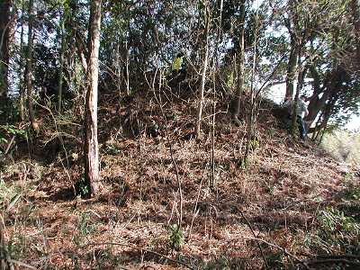 | 訪問記 | [2005/01/24]南側の堀跡と2郭3郭の間にバイパスを通す工事が行われている。まだ開通していないが間もなく車が頻繁に行き交うことになるだろう。この工事に関係する調査で門跡が確認されているそうだ。主郭中心部は藪が深いため西側の土塁・堀側から回り込むことにした。西側は大きく土取されているがここには帯郭があったのではないか、そこよりもさらに北側の残存遺構から推測する。城域東端の3郭には寺があったそうで、そこから出土した石塔残欠が常光院に置かれている。また、主客部から出土した石塊がそこに畑を持っていた某氏宅の八幡社周囲に並べられている。 |