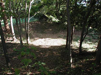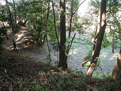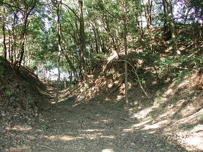 | 訪問記 | [2002/11/05]守谷小学校に声を掛けて枡形跡の見学をさせてもらう。小学校前の大手口付近から枡形へかけて土塁が残る。清水門付近は都市計画道路の影響で破壊が激しく土塁は壊滅に近い。その先の馬出郭の感じも分からなかった。現在、いわゆる平将門城址の北側水田一帯を公園とするための整備工事が行われている。郭Gから郭Cへの土橋に対して北側真横から厳しく掛かっている横矢(QuickTimeMovie-513KB-11秒)が気に入った。横矢・枡形・豪快な堀・土塁など中世城を堪能しました。みなさんにもお勧めです。 |