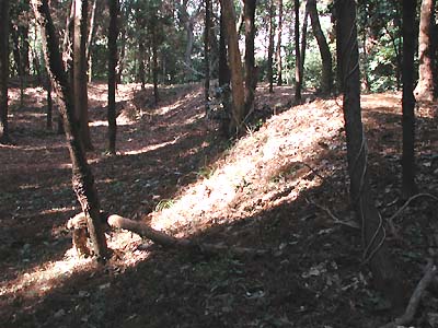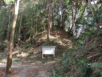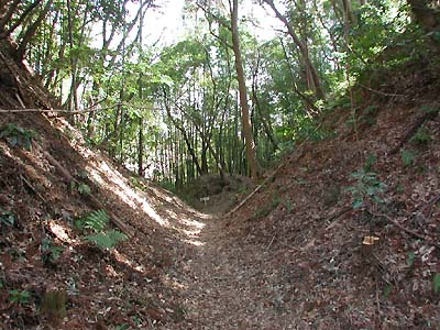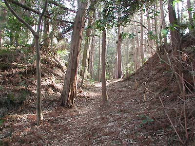 | 訪問記 | [2002/2/19]このお城へは辿り着くまでがたいへんです。今日は北側(このあたりをトウコウジビョウと言うらしい)に沿って細いオフロードを回っていったので心細かった。東山馬場に車を止めて城山、奥ノ山、倉跡、諏訪神社と歩き、改めてセッテイ山近くへ移動した。籔が深いと聞いていた「セッテイ山」が藪刈りされていてとても歩きやすかった。地元の「城址保存会」の方々の郷土に対する愛情が感じられました。 |
