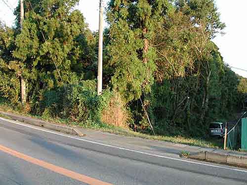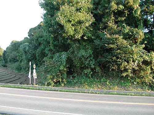 | 訪問記 | [2000/10/17]土塁の南側の(土塁と平行する)道を少し下った所で薮を分け入ると、土塁-堀-土塁の構造を確認できた。南側の土塁と北側の土塁は比高差があり、いわゆる比高二重土塁ということになるだろうか。県道の反対側(手前側)は造成工事のために残念ながら湮滅。 |