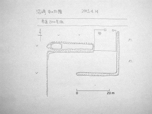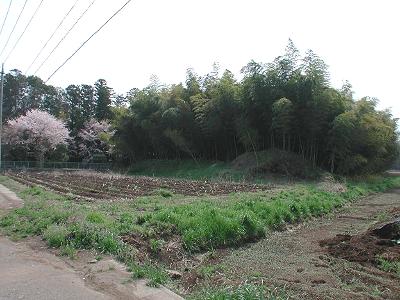 に教えてもらったので、さっそく行ってみた。高さ2m〜3mで長さ25mほどの土塁が県道に並行してある。ただ、土塁の表面には砂利がかなり目立つので最近の土塁なのかもしれない。南側の藪の中には方形の堀跡らしきものがある。