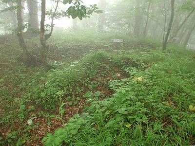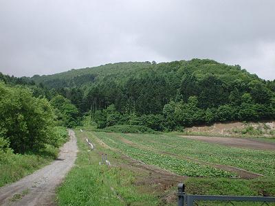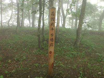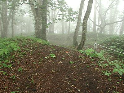 | 訪問記 | [2003/07/14]道案内が無いと台場へは行けないでしょうと言われた。それでも少しでも近くへ行ってみたいと、北電七飯発電所前の道を行けるところまで行ってみた。1.4kmほど行くと両側に農場があって、その先で道は左へ直角に曲がりまもなく通行止めのゲートで遮られた。直角のカーブの所に「七飯林道」の標識が立っている。方向的にはここからほぼ真北(写真正面)に台場はあるはず。帰宅後、地形図を見たら台場は正面の山の左側の山だったようで、ここからは見通せない場所にある。 [2003/07/21]先週、手前まで行って引き返してきたので、クマ対策の助っ人を頼みリトライ。七飯林道の途中から山道へ入り台場登頂に成功。頂上はガスに覆われ視界不良だったが登頂の満足感は十分。土塁の高さは現在でも1.5mほどあると書かれていたがそれはちょっと言い過ぎか。内部はかなり埋まりつつあり深さ1mといったところ。しかし、七稜郭の土塁構造は明瞭に残っているのがすばらしい。わずか三日ほどで造った台場が150年もの時間を超えていま自分の目の前に残っていることに驚きを感じる。『箱館戦争写真集』に「森,箱館までとどくすぐれた眺望をもつ」と書かれているが、今日はガスでまったく確認できなかった。これはちょっと残念。とても心配なのは山道にはバイクで走った轍が目に付き、土塁が壊されることに不安を感じた。七飯町さん、なんとか保護をお願いします。 |