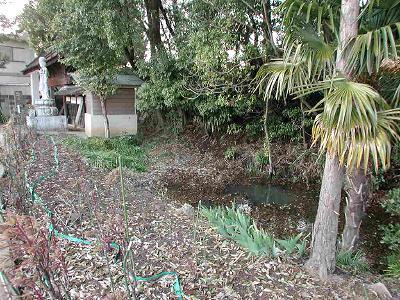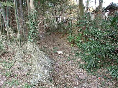 | 訪問記 | [2003/04/06]「UshiQnet」さん情報で行ってみた。境内周囲は土塁で囲まれその上には四国八十八ケ所を移したお堂が並んでいる。土塁の外側には一部空堀、一部水堀の跡がある。さらに、寺の西方に水堀跡があるらしく、これらが二重の濠を構成していたということだろう。 |