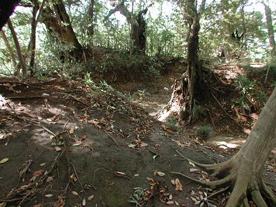 | 訪問記 | [2002/10/7]城跡の雰囲気を留めるのはこの白山神社境内だけのようだ。西側虎口周辺の遺構はなかなか興味深く感じた。西側虎口南側の土塁は相当低くなってはいるが横矢があったように見えるし、その虎口を出た正面の土塁には枡形があったのではないかと思わせるものがあった。 |