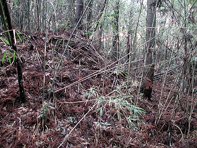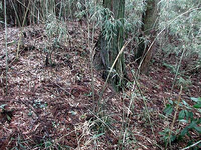 | 訪問記 | [2000/10/17]東へ50m程離れた所にもうひとつ小さな土塁跡。道の反対側(南側)にも0.5メートル程の盛り上がりとして土塁の一部がわずかに残る。沼里小学校の敷地に消えてしまった部分は「見上げる程の土塁だった」とは阿見町の大竹先生談。小学校向い側の杉林の中には土塁と堀が残っている。さらに道から50mほど奥には横矢と思われる折れがある。折れの途中から2〜3mほどの高低差で落ち込む。この堀底道から上がってこようとする敵に対しては横矢を掛けやすいだろう |