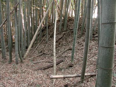 | 訪問記 | [2001/04/16]ここの城郭遺構は調査されていないとの話を聞きました。大きな土塁や櫓台が残っているだけに残念です。 [2002/12/15]如来寺墓地北側の藪中にある大防古墳群第3古墳は物見台にでも使われたかもしれない。 |