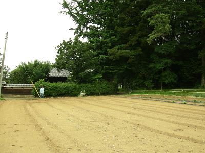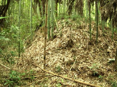 | 訪問記 | [2006/06/05]石崎氏が先週見つけた土塁・堀切。地元でも小幡城の外堀と伝えられているそうだ。西側の土塁の位置がやや北にずれていることから、四足門のお屋敷の門のところで食違い虎口になっていたものと思われる。 |