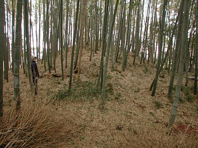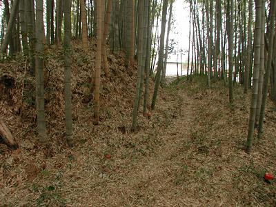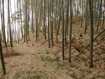 | 訪問記 | [2003/02/04]大杉神社稲荷社近くの駐車場に車を留めて南側のお宅に見学のお願いに行ったところ、快諾して頂けた。「笈ノ塚」と呼んでいるが、城という話は聞いていないそうだ。また、台地東端の山を「オヒジリ山」と呼んでいると教えてもらう。「御聖山」ということか?ここも物見台のようになっているが、笈ノ塚で十分にその役目を果たしていると思う。ただ、ここは「狼火台」だという話も聞いているので狼火台と物見台の組み合わせかもしれない。笈ノ塚は三段ないし四段構造になっている。また、しっかりと確認しなかったが、単純な同心円でなく、下の段は方形だったかもしれない。 |