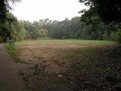 | 訪問記 | [2002/10/6]岡神社へ辿り着くまでがたいへんだった。周囲は道が細いので行かれる方はご注意下さい。後で分かりましたが、岡神社の急な階段を上るよりも、北側の地区公民館あたりから山道を登っていくのが行きやすそうです。高所恐怖症なもんで、へっぴり腰になりながらも恐る恐る神社の急な階段を登りました。登り切ったところに大日山古墳があり、その上に岡神社が祀られています。その裏側は平坦地で本郭があったのだろうと想像。平坦地の東側に低くはなっているが土塁が残っています。そこから坂を下りるとさらに広い平坦地が広がっていて、腰郭のように使われたのだろうかと想像。 |