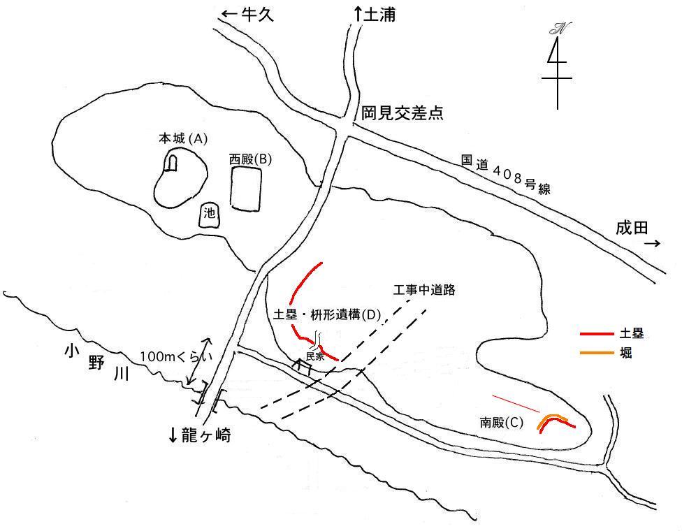 | 概説 | 本城は、戦国時代牛久地方に割拠した、岡見氏発祥の地である。岡見氏は、南北朝期の小田治久の2子某が岡見に封ぜられてから興り、一族はやがて牛久、足高、谷田部等に築城し勢力を伸ばした。しかし、天正18(1590)年小田原落城と共に滅亡した。 天保年間の村絵図には、古城が3ヶ所描かれている。それは今回調査の岡見の本城と言われるものと、溜池の台にある郭、さらにこの地点から南東へ約1km位下った舌状台地突端に1ヶ所描かれている。しかしこの中間に、枡形付きの虎口、大きな延々と続く土塁、そしてこの土塁の外側を幅10m位の腰郭で固めた新しい郭がある。それにしても、なぜ天保年間にこの地点を古城と考えなかったのか。現在見られる遺構と同じ位のもので城跡と判定するには不定であったものか。そうだとすれば、これは最新式の城郭築造初期の段階で、政権の交替期にぶつかり情勢が一変したため、構築を中止したものであろうか。[『重要遺跡調査報告書II(城館跡)』より] (城址碑の南東約1200m付近の丘陵上に)土塁址を見出したが、館らしい所が充分整っておらず、古式を思わせるので、南殿であろうと推定した。もう一つ(その西側)にもあった。これは南に大手口をもち、そこから大きな土塁が伸びていたが、北は畑で土塁や堀がみえず、埋もれたものか、まだ未完成のうちに戦国時代が終わってしまったのか、詳しく調査しないと分からない。[『岡見氏の系譜について』より] つまり、岡見城の城域は以下の4ヶ所に分布していることになる:(A)城址碑のある「本城」、(B)溜池東側の「西殿」と思われる郭、(C)城址碑の南東約1200mの台地上にある「南殿」と思われる郭、(D)県道東側(「南殿」西側)の土塁・枡形遺構 |