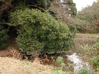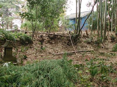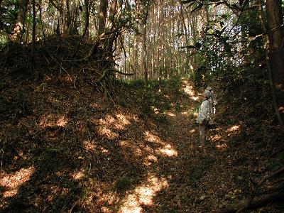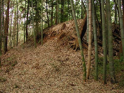 | 訪問記 | [1998/03/23]今日は城址碑を探し当てただけ。 [2000/12/11]岡見城城址碑の左側を奥へ進むと土塁・堀がある。さらに進み下ると溜池がある。かつては水堀として機能したのかもしれない。石碑の右手へ土塁に沿って80m進むと本郭へ入る虎口がある。 [2002/01/02]本城東側の溜池のさらに東側に方形の土塁・堀に囲まれた一画がある(B)。郷土史家の雨谷昭氏はここが『岡見氏彦根系系図』および『小田氏系譜』に出てくる「西殿」ではないかと言っている。夕方になって急に空が暗くなり雪が降り始めたため写真は撮れなかった。 [2002/10/13]岡見城の遺構は城址碑のある本城だけでなく、4ヶ所に分布するらしい。今日は県道木原竜ヶ崎線の東側遺構(C)および(D)を見に行った。南殿(C)は藪が深く登らなかった。作道は見つけたので冬になってからもう一度登ってみるつもりだ。そういえば道路工事によって南殿は岡見の台地から分断されかけていた。遺構(D)の台地の角に枡形虎口と思える地形があった。「幅10m位の腰郭を備えた大きな延々と続く土塁」かと思って上へ登ったら土塁でなく平坦地だった。しかしここは下から見ると延々と続く壁のようだった。 [2002/10/22]前回10月13日に歩いた地点より西側の県道との間を歩いた。台地の南縁に民家が一軒あるがそのすぐ西側台地上に折れのある土塁が数十mに渡って残存。この折れは横矢なのだろう。さらに茎崎町の「若栗城」の櫓台跡を彷彿とさせる物見台様の遺構もあった。 [2003/03/09]南殿の台地上は一部畑になっている。北側の林の中にわずかに土塁・堀と思われる遺構がある。 [2003/11/02]今日は秋晴れの中、天保年間の村絵図コピーを持って、総勢7人で岡見城全体を歩いてみた。戦国期の本城と思われている遺構(A)だが、一周してみると方形館址ともとれる形態であることが分かる。ここも案外古い時代のものかもしれない。城址碑から右手(南西方向)へ70mほど行ったところにある虎口は後世開けられたものとづっと思っていたのだが、土塁に食い違いの構造が見られるのでオリジナルの遺構であることを確認。西殿と考えられる遺構(B)の方形館址は造りに徹底さが感じられないという感想も出た。西側の土塁はけっこう良い感じ。南殿と思われる遺構(C)の台地先端部には堀切とそこから伸びる横堀があるが、郭内部には構造物はなく「南殿」といわれるほどの者が住まいしていた場所なのか疑問が出る。むしろ、南側の小野川と対岸を見張るための駐屯地を兼ねた物見郭的場所だったのではないかとの意見が出る。虎口・櫓台・枡形・土塁遺構(D)はその両側の土塁から横矢を掛けたかなりしっかりした構造に造られている割に、内部には何も無い、という意外なもの。土塁は西側へさらに延び北へ向きを変えて消滅している。地元の人に聞いたところここいらは「八幡山」と言うそうだ。天保期の村絵図にも八幡社が描かれている。岡見城というのは何だかさっぱり分からないお城だ。 |