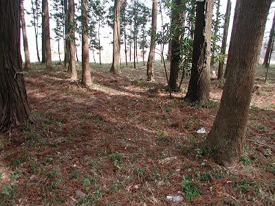 | 訪問記 | [2000/11/19]工業団地とは関係なくすでに湮滅していたのかもしれない。 [2003/03/02]残っていました。今まで何度も探しに来て、強いて言えばこのうねりがそうかな、と思っていたが確信は持てず、完全湮滅かもしれないと思っていた。50mほどの間隔で二条あり、大きかったと言われる西側土塁の北側部分は湮滅し、南側部分は残る。東側土塁の北側部分は僅かな高低差が残るだけで気づかないくらい小さく、南側部分は林の中に湮滅。ここにある「お姫様之墓」は江戸崎土岐氏滅亡の際に飯倉のI家に落ち延びた悲劇のお姫様のお墓、ということになっているそうです。このお姫様の落ち延び伝説は他に「美浦村大塚のH家」と「美浦村木原のI家」にあるそうです。 |