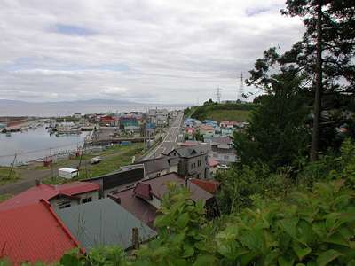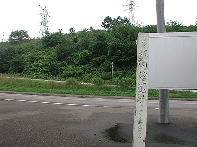 | 訪問記 | [2001/7/23]穏内館があった丘は開削されて現在国道228号線が通っている。大型土壙の一部は残っているそうだが、見える状態ではないとのこと。 [2002/6/24]吉岡川の東岸にある吉岡八幡神社の裏山(吉岡台場跡)から穏内館方向を望む。国道228号線が館跡を縦断している。 |