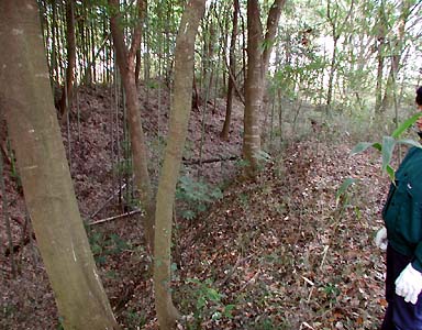 | 概説 | 永正12(1515)年頃から小田軍の攻撃をうけ、数回の戦の結果、ついに景成[注:江戸崎城主土岐原景成]は小田氏の軍門に降った。五代治頼は小田氏の被官として仕えたが、天文11(1542)年頃より次第に勢力を挽回するに従い、小田氏に対して半独立の形をとり、やがて、信太郡全域に武力討伐を始め、その大半を領有するようになった。その間に小田氏も数回の攻撃を繰り返すが、天文17(1548)年の戦いでは、土岐原氏の輩下であった泉城城主、東條重定は小坂で戦って戦死している。ここで推定されることは、この小坂での戦いで、東條重定は土岐軍の将として、小田氏に味方をした岡見氏の領有する小坂城を攻撃したものか、それとも、小坂城はすでに土岐原氏の領有になっていて、東條重定は小坂城において、小田軍を迎えたものか、これらの点については、まだ、的確な史料は得られない。しかし、そのころの情勢は、まだ小田氏が優勢であり、小坂一帯は小田勢力圏にあったものではなかろうか。[「小坂城跡」より抜粋] QuickTimeムービー(約440KB):一の丸土塁上から二の丸側の堀を見ました。はっきり言って見る価値ないです。高速回線の方のみどうぞ。 |