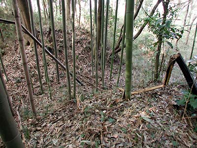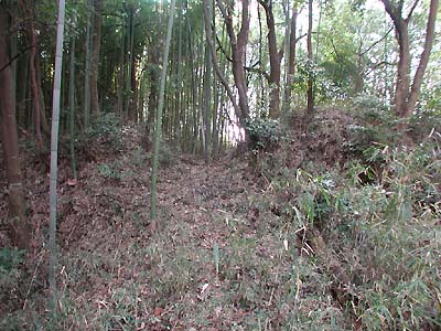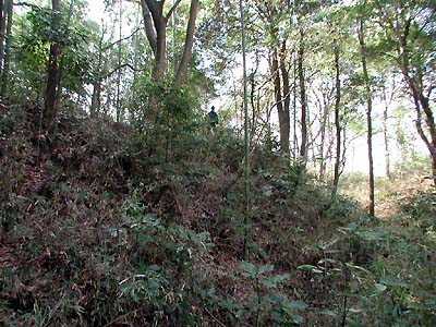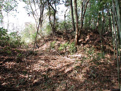 | 訪問記 | [2000/]下記の資料には本丸・二の丸・土塁・壕等がそっくり現存、とあるが切通しのために本丸の南端部分は湮滅していると思われる。北側の住宅地へ回ってみたが、金網で囲われており内部へ入ることができるかはわからなかった。 [2001/01/22]国道沿いから藪へ入ってみると、かなり埋まって浅くなっているが堀跡のようなものが。 [2001/03/06]3回目の挑戦は「マムシ注意の看板」の所から。しかし、まだ郭内へ到達できない。 [2001/12/17]一の丸東側城壁を登るアプローチを聞いていたが、どうしても分からなかったので近くを通りかかった地元の方に尋ねたところ、二の丸北西端の擁壁の切れたところから取り付くのがよいと教えてもらった。実際、ここから上がるのをお勧めします。 二の丸と三の丸は土塁も曲輪もガサ藪。しかし、二の丸と一の丸間の土塁上へ出た途端にすばらしい堀と土塁が現れた。一の丸は外側(二の丸側)には土塁があるが、内側(本丸側)には土塁がない。本丸北東端に立派な櫓台がある。また、本丸北壁土塁上には20mほどにわたって横矢の出張りがある。曲輪や土塁・堀の配置が巧妙な印象。 |