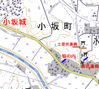| 所在地 | 茨城県牛久市小坂町。国道408号線沿いで小坂城の南東約480m。国道408号線上小坂バス停から200mほど西へ(MobilGSから西へ30mほど)行ったところを北側へ入り、50mほど進んだ辺りで右手斜面にある古い階段を登ったところの右手に堀はある。慈眼院は上小坂バス停付近から北へ入っていくとすぐ突き当たり。 |