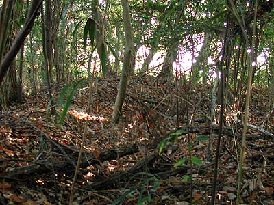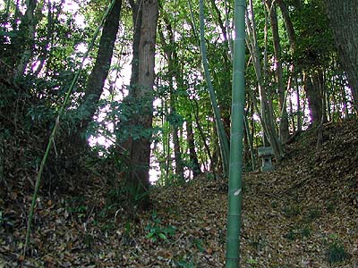 霞台カントリークラブの酒井側の門が開いていたので(村道が通っているらしい)そこから入ってすぐ左手の酒井集落を見下ろせる林へ登る。しばらく南へ歩くと写真1.の堀切がある。対岸は土塁で囲まれている。その土塁上をさらに進むと写真2.の郭の先端部と思われる部分に達する。