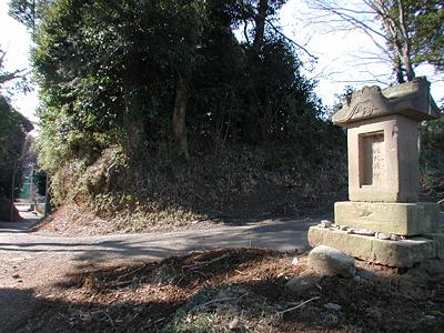 | 訪問記 | [2003/01/26]弁天池を見に行く。 [2003/02/03]佐倉神社から東へ向かう道沿いに土塁が切れ切れに残存する。松姫大明神の祠はその道の東の突き当たり交差点のど真ん中にある。祠の南側角の土塁はかなりよく残っている。そこから60mほど南へ行った右手の崖下に2基の野仏が立っているが、その左側は道標としても使われていたらしく、「右阿波かしま 西キハラ土浦 左さく道」と書かれている。「西キハラ土浦」というのは良いとして、「右阿波かしま」というのが方角的に面白い。実際の阿波は南東方向になるが、当時は船で往来していたと考えれば右手、つまり北側霞ヶ浦方向ということでこれで良いわけだ。さらに、推察するに、ここから北へ進むと「荷下(ニクダシ)」という地名の残る場所へ出ることになる(「佐倉殿屋敷」もご参照下さい)。ここには霞ヶ浦水上交通の舟着場のようなものがあったのかもしれない。 |