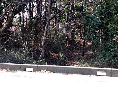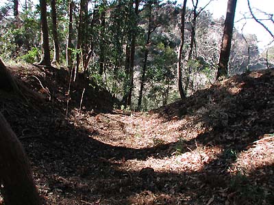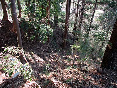 | 訪問記 | [2002/1/28]昨年5月28日に初めて訪れたときには間違えて文化幼稚園の脇にあると報告してしまいましたが、つい最近、茨城城郭会の五郎さんが正確な場所を確認されたので見直してきました。上に写真で示した北側部分が50m強、南側部分が200mほどあり、セオリー通り両端が竪堀となって谷津へ落ち込んでいました。全長に渡ってよく残っています。 |