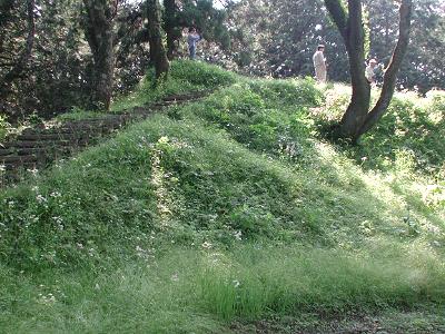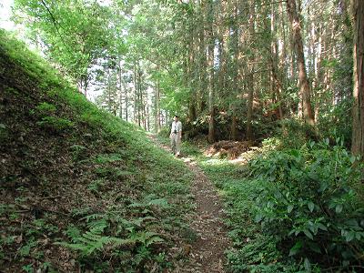 | 訪問記 | [2005/06/06]予定外だったが、時間があるのでちょっと寄り道。城址の南西側の道路から山道を上がっていくと右手に水道施設があるのでそこから左手へ進むと左手に堀とI郭、右手には二重土塁が現れる。さらに進むとII郭南端部の巨大な土塁が現れる。写真ではあまり大きく見えないのが残念。この土塁の北側端には展望台が作られている。 |