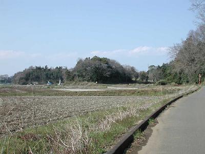 | 訪問記 | [2003/04/06]地元の方に聞いたところ、「三角山」というのは道が三角に交わるので付いた字名だと教えてくれた。この小山は観音山と言って昔は観音堂があったらしいが今は水天宮の石の祠があるだけ。現在は直径約50m程の小山だが、かつては北側の台地と一続きだったらしい。周囲の水田整備のためごっそり土取されてしまったとのこと。水天宮まで登りたかったが、昨日の大雨の後で足場がぬかるみ急坂は上れそうになかった。 |