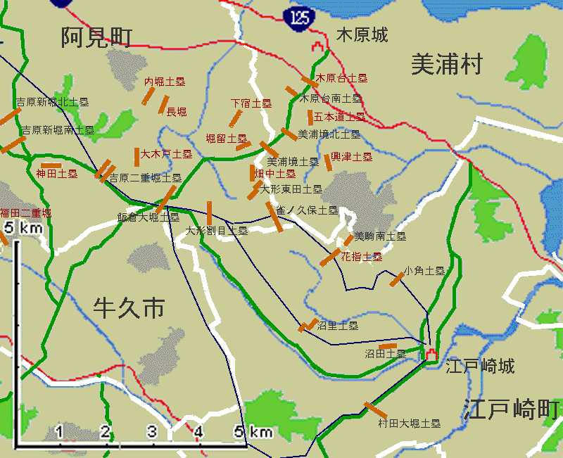10月20日(2000年)の茨城城郭会でのチャットの折、「街道閉塞用の土塁群」を話題にした所、土塁は茨城の他地域にも点在してはいるものの、江戸崎、阿見、美浦地域のように数百メートル間隔で存在するようなところはないようだということを知りました。わが『美浦村お散歩団』としてはこの地域に集中する「街道閉塞用の土塁群」についての話題を提供しようとここにまとめてみました。とは言うものの文献で調べようと思ってもこれら土塁に関する記述は残念ながら多くはなく、と言うかまとまった形では「阿見町史」以外には知りません(誰か知ってる方がいたらお知らせ下さい)。そこで、次の情報が手に入るまではこれに沿った形でまとめておきます。[その後、西ケ谷恭弘著『日本史小百科城郭』P16に割目・雀久保・飯倉大堀・飯倉二重堀の長塁がわずかに紹介されていることを知りました]