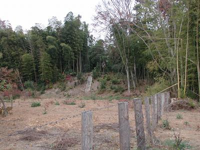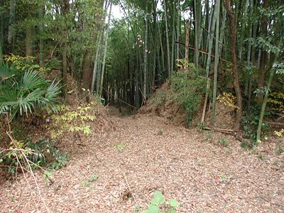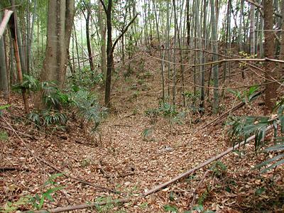 | 訪問記 | [2002/11/24]『明野町史』によると「南北方向が約225m、東西方向が約125mで、南北を長軸とした長方形単郭の構造である」と書かれているが、南北はその二倍の城域を考えてもよさそうだ。少なくとも北側には低い土塁で囲まれた二ノ郭とさらにその北側には外郭と考えられそうな平坦面もあり、『明野町史』では描かれていない部分への広がりも確認できた。それにしても屋敷の北側を囲む土塁は、中央部に折り邪(ひずみ)の横矢を備え、高さ10m〜高い所では15mはあろうかと思われるみごとなものだった。道路の南側域に関しては土塁の一部はあるが住宅が建て込んでいて遺構はほとんど隠滅しているようだ。 |