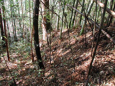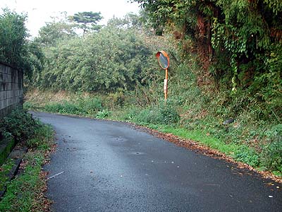 | 訪問記 | [2000/11/07]薮で覆われていて写真ではわからないがカーブミラーのすぐ左には木原城へ向う戦国時代からの古道が通っている。土塁がある場所はまさに馬の背状の細い尾根部分。 |