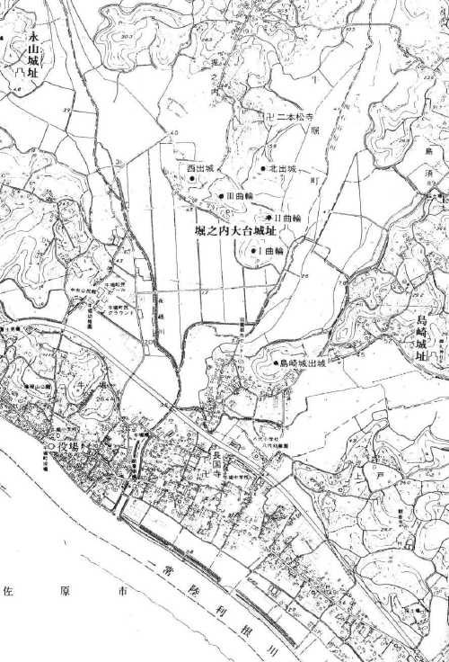 | 概説 | 常陸大掾氏の一族である島崎氏は「南方三十三館」と称される鹿島・行方両郡の諸豪族の筆頭的地位を有していたが、天正19年2月佐竹義宣によって滅ぼされた。 以下、郭の名称は「図説中世城郭事典」に依る。また、現地の教育委員会の説明板の記述に依れば郭Iと郭IIの間の空間は馬出と呼ばれているようだ。 |