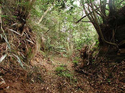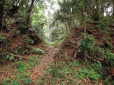 | 訪問記 | [2001/04/29]なかなか豪快な作りの城。土塁も堀もよく残っている。縄張図を見ると郭Vの北から西へかけては執拗に横矢が設けられている。県の依託を受けて1週間に1回程度(普段は日曜日の午前中)見回りをしていると言う方に聞いた話に依ると:水の手郭には井戸跡があって今は2mくらいの深さまで埋まっている。御札(みふだ)神社のある郭Iの北側土塁を「鐘突き堂」と呼んでいた。神社から見渡す風景は昔とあまり変わっていない。しかし郭Iを取り囲む土塁はもっと残っていた。発掘調査時に発見された貴重な遺物は再び埋め戻した、などなど。 |