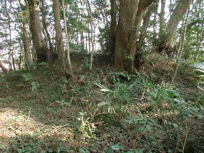 | 訪問記 | [2004/03/14]島崎城が南西側へ腕をぐいっと突き出したような丘陵の先端にある。昔の航空写真を見たところ、丘陵の付け根部分は畑、先端部分は森林になっていたようだ。今日行ったのは先端部分だった。北西側からの道を上がっていくと頂上にはかつて神社が祀られていた直径5m、高さ1.5mほどの壇があった。また、その西側には浅く低くなっている堀と土塁に囲まれた方30mほどの郭があった。 |