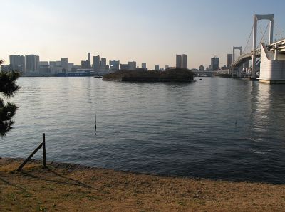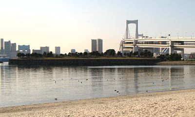 お台場海浜公園砂浜より臨む。右手はレインボーブリッジ![]() |