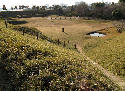 | 訪問記 | [2007/01/15]幕末に作られた台場遺構の中で全国的にももっとも良好に残されているもののひとつだろう。また、台場の規模・堅牢さでは函館の弁天台場、広さでは大洗の祝町向洲台場などと同レベルと思われる。その意味でも一度見ておきたかった。胸墻の比高は『品川台場史考』の図表に5間4尺6寸とあるからざっと10m、天下普請とは言えこれをおよそ100日くらいで作ったらしいのだが埋め立てを考えるとすごいと感じる。 |
