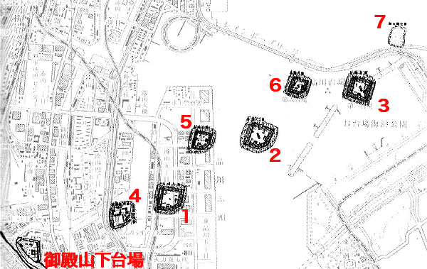品川台場配置図[『品川台場史考』扉図に番号を附した](クリックで拡大)![]() |