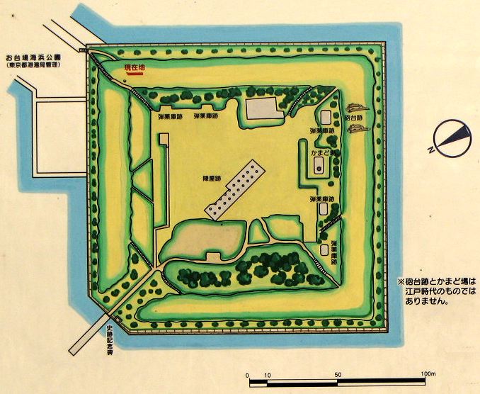 | 概説 | 江戸幕府が黒船来襲に備えて品川沖に築いた砲台跡。設計者は伊豆韮山の代官・江川太郎左衛門英龍で、ペリーが浦賀に来航した翌月の嘉永6年(1853)8月に着工、1年3ヶ月の間に6基が完成した。現在は大正15年(1926)に国の史跡に指定された第三、第六台場だけが残されている。第三台場は、昭和三年東京市(都)によって整備され、台場公園として解放されている。周囲には、海面から5〜7mの石垣積みの土手が築かれ、黒松が植えられている。また、内部の平坦な窪地には、陣屋、弾薬庫跡などがある。29,963.40平米。大正15年12月20日に外周30間(約55m)の海面を含み史跡指定されている。[現地説明板より] 築造年:第一〜第三台場は嘉永6年(1853)に築造され、第四〜第七台場と御殿山下台場も嘉永7年(安政元年)(1854)築造開始されたが、第四台場は7分、第七台場は3分で中止された。 撤去年:昭和14年(1939)第四台場、昭和32年(1957)御殿山下台場に台場小学校開校、昭和36年第二台場、昭和37年第五台場、昭和38年第一台場、昭和40年第七台場。[『品川台場史考』年表を参考にした] |