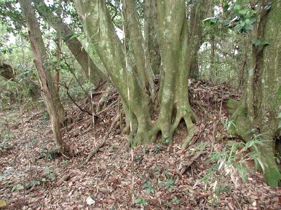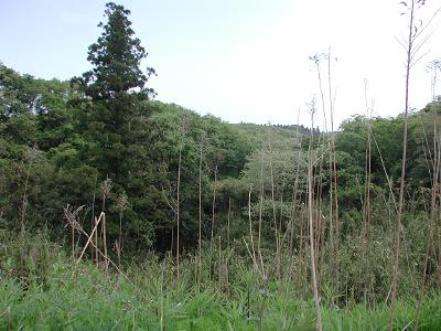| 訪問記 | [2005/05/09]その辺りはものすごい藪のようで、どこから近づけばよいのか分からず、本日は遠望写真のみ。 [2005/07/25]やはり思った通りの激藪だった。今日は幸い案内人に連れて行ってもらえたが、一人ではまったく辿り着けなかったことだろう。ジャガイモ畑の奥の藪の中にあるが、その畑が耕作放棄されて荒れてしまえば近づくことは不可能になると思えるような場所だ。 |