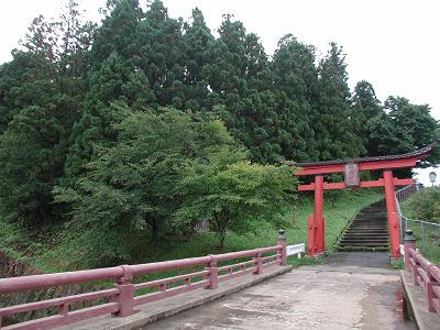 | 訪問記 | [2003/09/20]北側を流れる高館川は天然の堀。稲荷神社のさらに上に郭があるが、雨上がりの急斜面のため登れない。南側はりんご園。 |