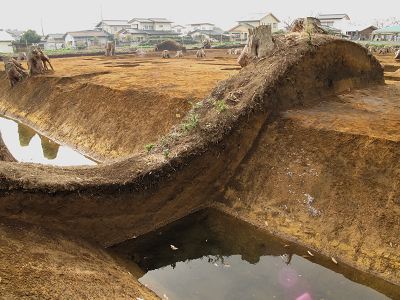 堀と土塁の断面。当時もこのような水堀だったと考えられる![]() |