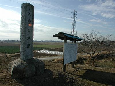 | 訪問記 | [2003/01/07]昭和61年8月の台風10号による決壊口碑の近くの堤防上に城址碑はある(もうひとつの城址碑はそこから西へ降りた高圧線鉄塔付近にある)。その西側一帯が中城といわれる豊田城の中核部分と思われる。微高地といえばいえそうだが小貝川改修と耕地整理・基盤整備により周囲とあまり高低差はなくなっている。かつては土塁があったようだ。中城の西側には堀切もあったらしいが面影はない。集落内の龍心寺裏側に土塁があるが城のものかは分からなかった。 |