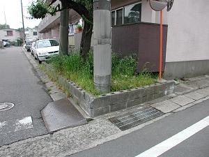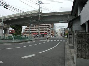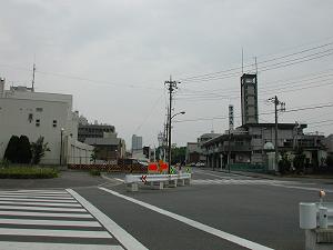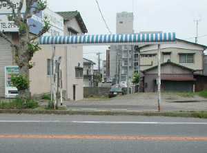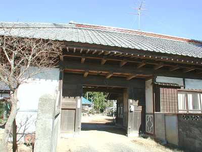 | [28]丸馬出のあった西門跡 田中口のかためで、北門ほどではないが小さな馬出があり、その手前に西門があった。この門は、新治村上坂田小林氏が払い下げ、自宅の正門として現在も一部が残されている[2004年1月現在]。写真奥の交差点が馬出部分で土塁はその向こう側にあった。 |