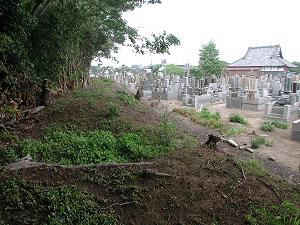 [31]東光寺の土塁 南門の左右には、上沼(文京町南側一帯)と下沼(桜町三丁目一帯)をつなぐ堀に沿って、土塁が構築されていた。現在は、ほとんど崩されて東光寺境内南西隅にわずかに残る。 |