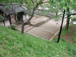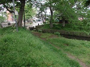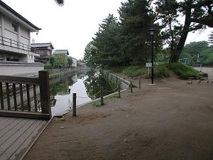 | [6]二の丸・外丸間の堀・土塁 公衆便所の南側に堀の北側半分が残る。南側は埋められている。ここで、往時から石橋の下を通って本丸堀と二の丸堀の水が繋がっていた。 |