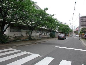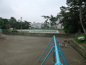 | [8]厩跡 二の丸南隅、現在は土浦小学校プールがある場所に馬を飼っていた。写真は馬場の方向から見たところ。 |